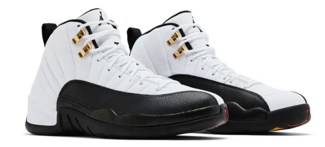 The 2025 edition of the Air Jordan 12 Retro 'Taxi' revives an OG colorway, featuring a white leather upper with radiating stitch lines and upper molded eyelets in metallic gold. Black lizard-textured overlays offer improved support and durability, while Jumpman branding adorns the tongue and a pull tab affixed to the heel. Performance benefits include a lightweight Phylon midsole with full-length Zoom Air cushioning. Underfoot, the outsole is equipped with herringbone traction pods and an exposed carbon fiber shank plate.